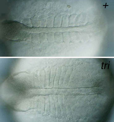 OPTICS: MAGNIFICATION: DATE OF IMAGE: SUBMITTER COMMENTS: Wild-type (top) and mutant (bottom) embryos. Both the notochord and somites are shorter and wider in mutant.