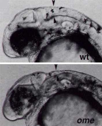 OPTICS: MAGNIFICATION: DATE OF IMAGE: SUBMITTER COMMENTS: Wild-type embryo (top); mutant embryo (bottom) with reduced ventricle. Arrowheads outline the border of the hindbrain ventricle anterior to the otic vesicle (asterisk).