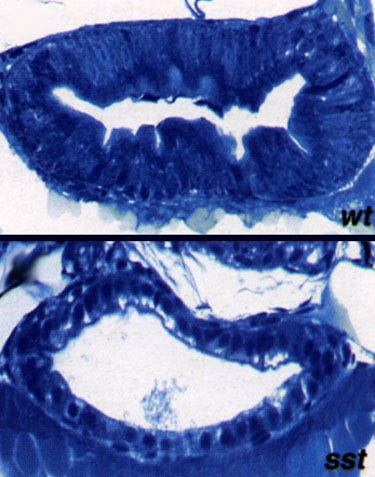 OPTICS: MAGNIFICATION: DATE OF IMAGE: SUBMITTER COMMENTS: Histological sections through mid-intestine of wild-type (top) and mutant (bottom) embryos. In the mutant, epithelium is not fully polarized and shows signs of degeneration.