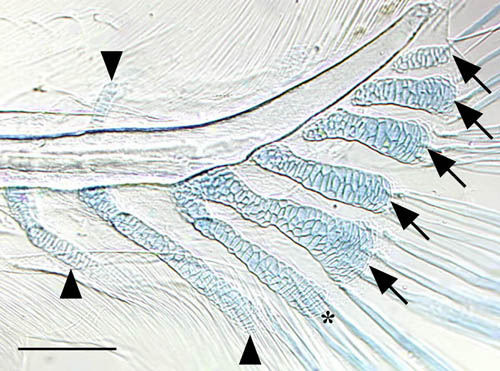 Description: Image showing skeletal development within the caudal fin of a larval zebrafish, 5.8mm SL. The parhypural and hypural 1, which form initially as independent condensations (see hypural1.jpeg), fuse proximally. Preural centra 1 and 2 and the urostyle are not ossified at this point. Scale bar = 0.1mm, arrows = hypurals 1-5, * = parhypural, arrowheads = hemal spines (ventral to notochord) or neural arch (dorsal to notochord)