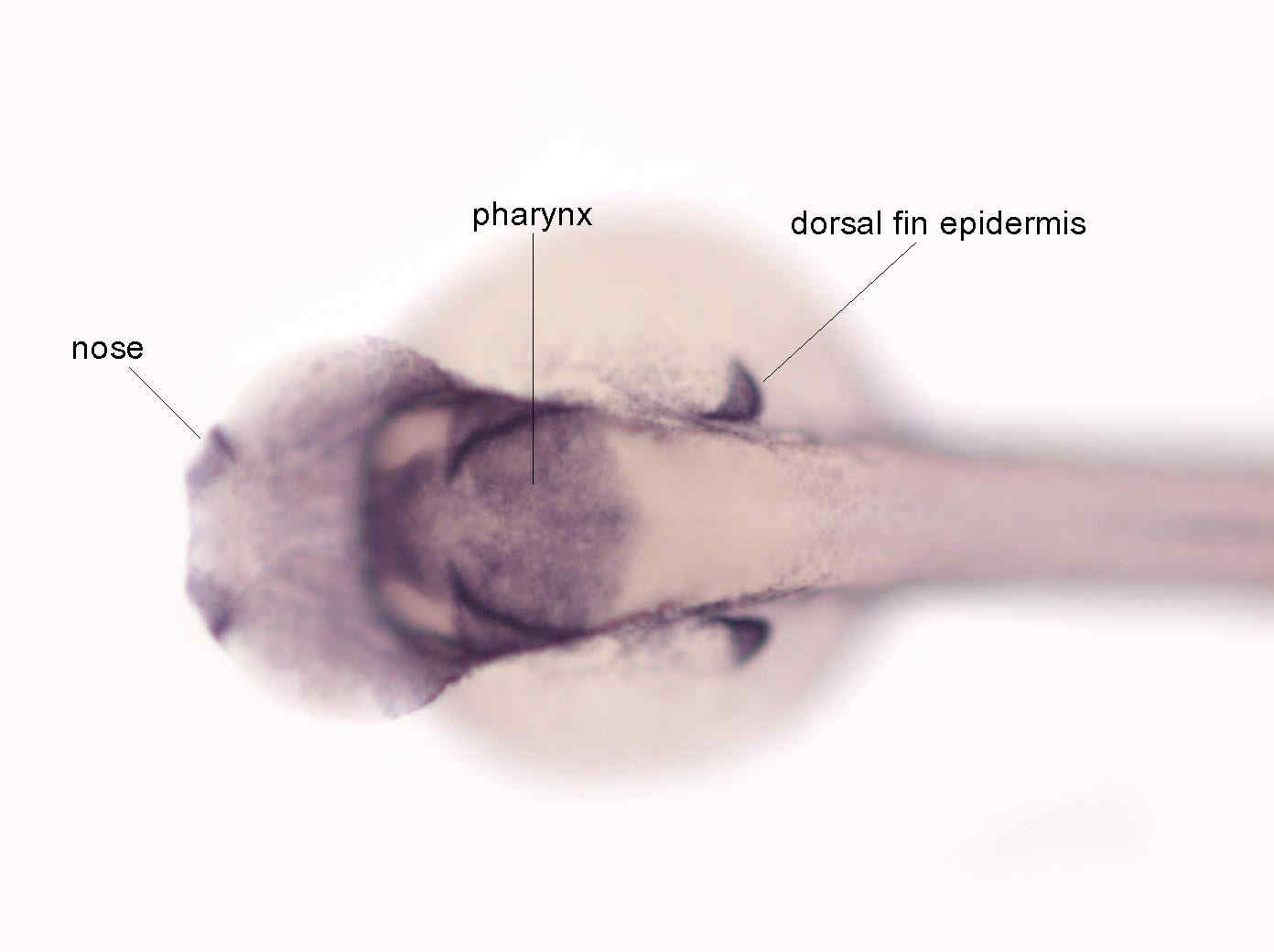 Fig. 6 Epidermis, branchial arches, distal part of pectoral fin epidermis, pharynx. Lateral line and nose appear as an unstained territory surrounded by labeled epidermal cells.
