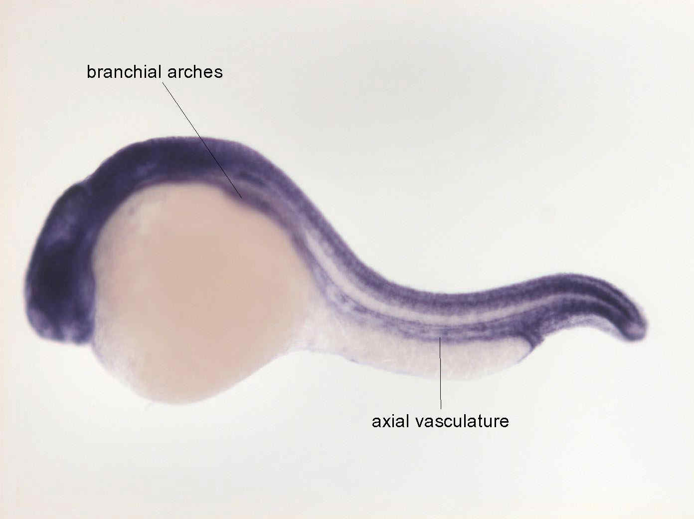 Fig. 4 Expression in many tissues with more staining in central nervous system, hypochord and axial vasculature.