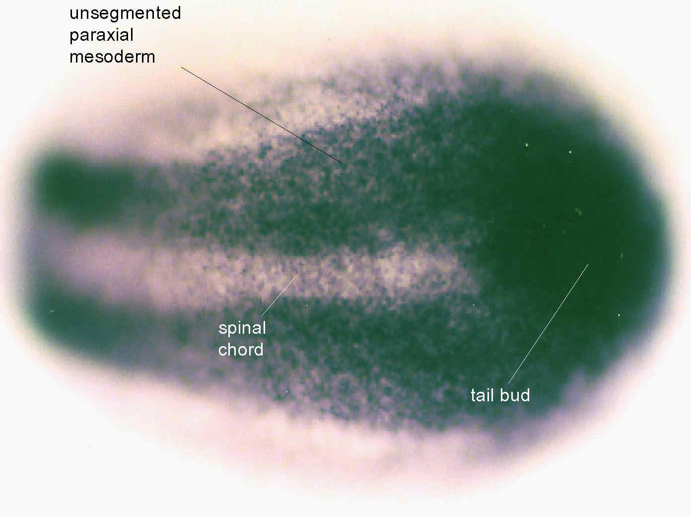 At the bud stage the marginal expression at gastrulation encompass about 1/4th of the embryo in posterior region including the tail bud. Staining is observed in axial mesoderm, forebrain and anterior paraxial mesoderm