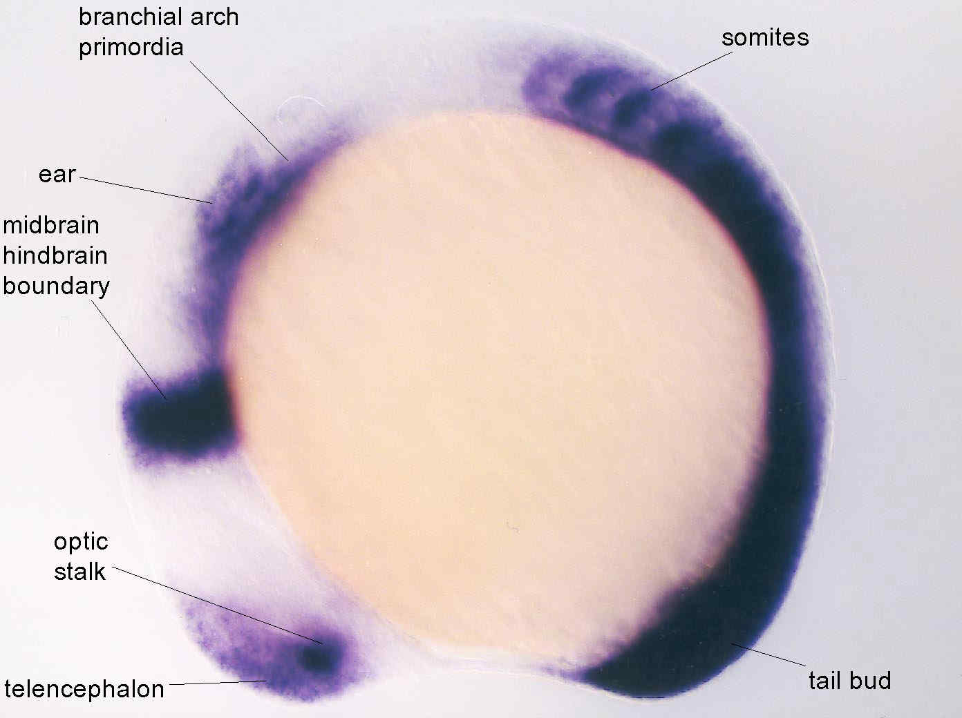 Fig. 4 At middle somitogenesis, staining increases in telencephalon, optic stalk, midbrain hindbrain boundary, but disappears from hindbrain. Otic placode express Sef. A strong expression is also observed in presumptive branchial arches, somites, and tail bud. No staining i s observed in notochord and adaxial cells but posteriorly an expression is detected in hypochord.
