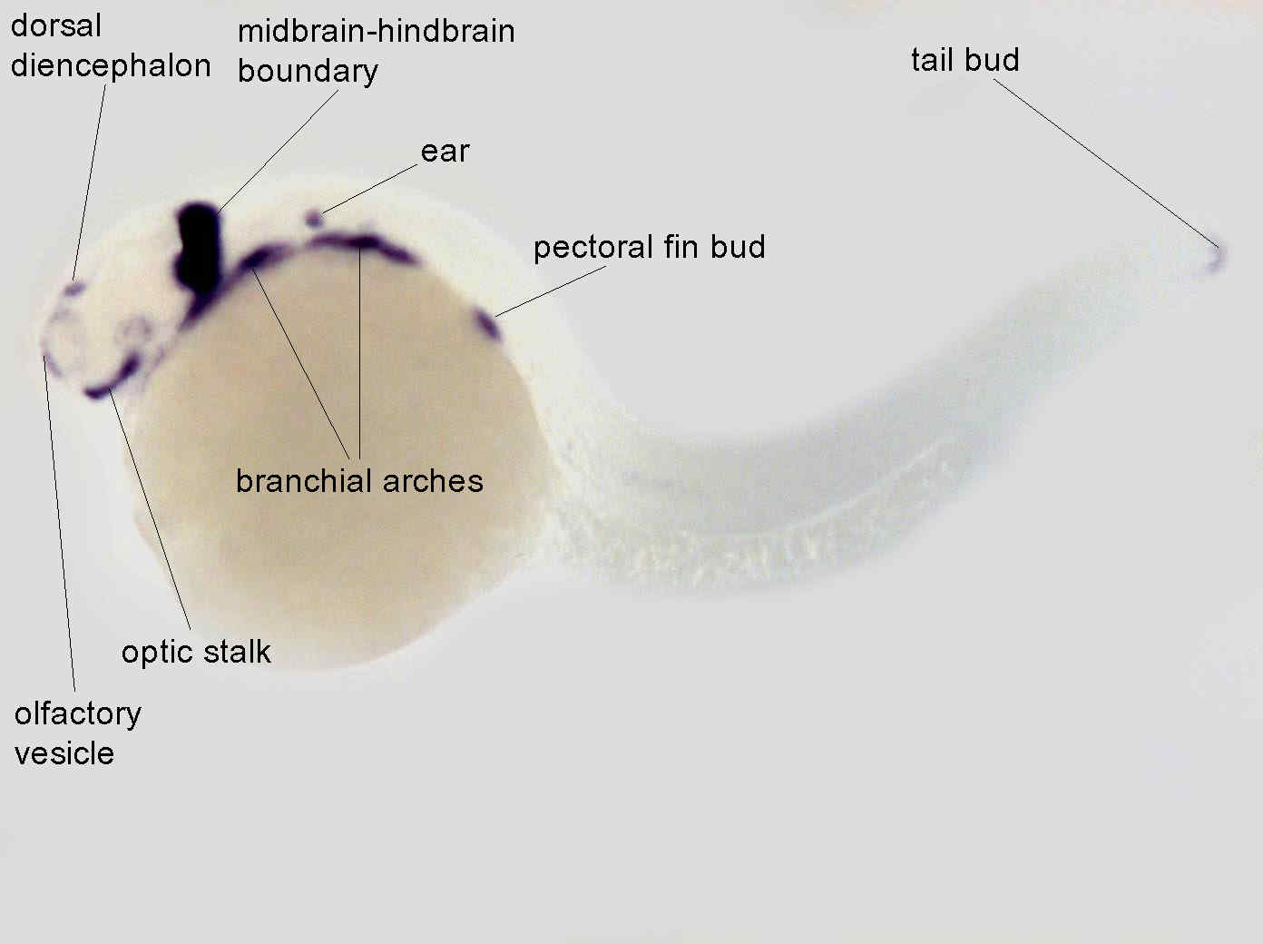 Fig. 5 Expression is very strong at the midbrain hindbrain boundary, in optic stalk and branchial arches. Expression appears in lens, olfactory vesicle, lateral line primordium, pectoral fin bud and dorsal diencephalon. Expression is maintained in telencephalon, tail bud and otic vesicle. In anterior somites, adaxial cell start to express Sef Caudally the remaining expression in somites is observed in the most anterior cells of each somites.Sef expression in most territory follow expression of FGF8. In branchial arches Sef expression follows the expression of FGF3.