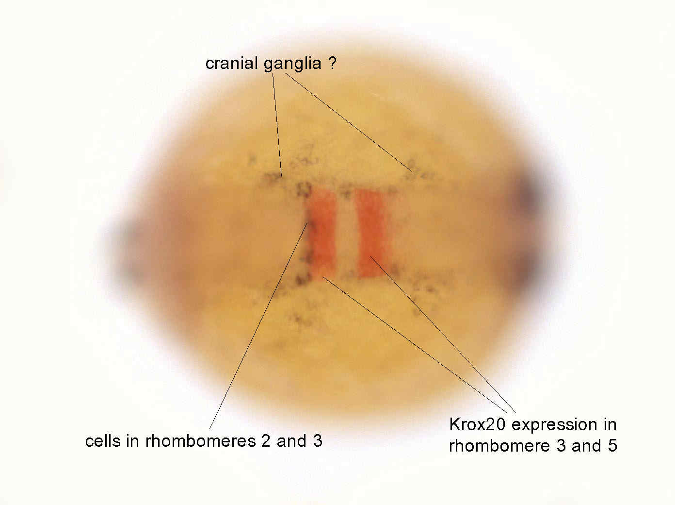 double labelling CB308 (blue) and Krox20 (red) identifying the expression territory of CB308 in the hindbrain at the level of the border between rhombomere 2 and rhombomere 3