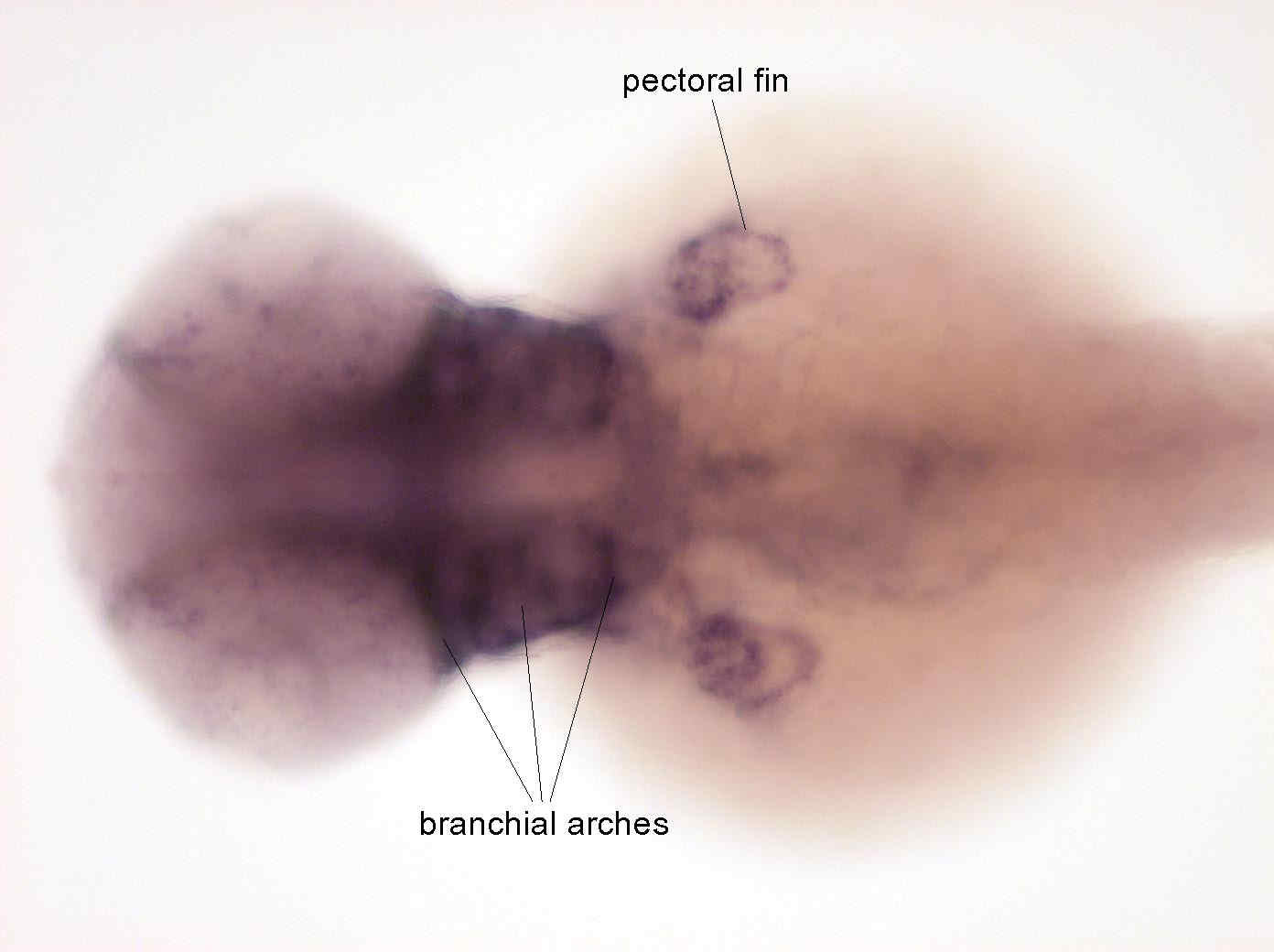 Fig. 7 In pectoral fin, snail1 is expressed in the mesenchyme under the apical ectodermal ridge as well as in the pectoral fin muscles. Snail 1 expression is also observed in the pharynx, oesophagus and intestinal bulb.