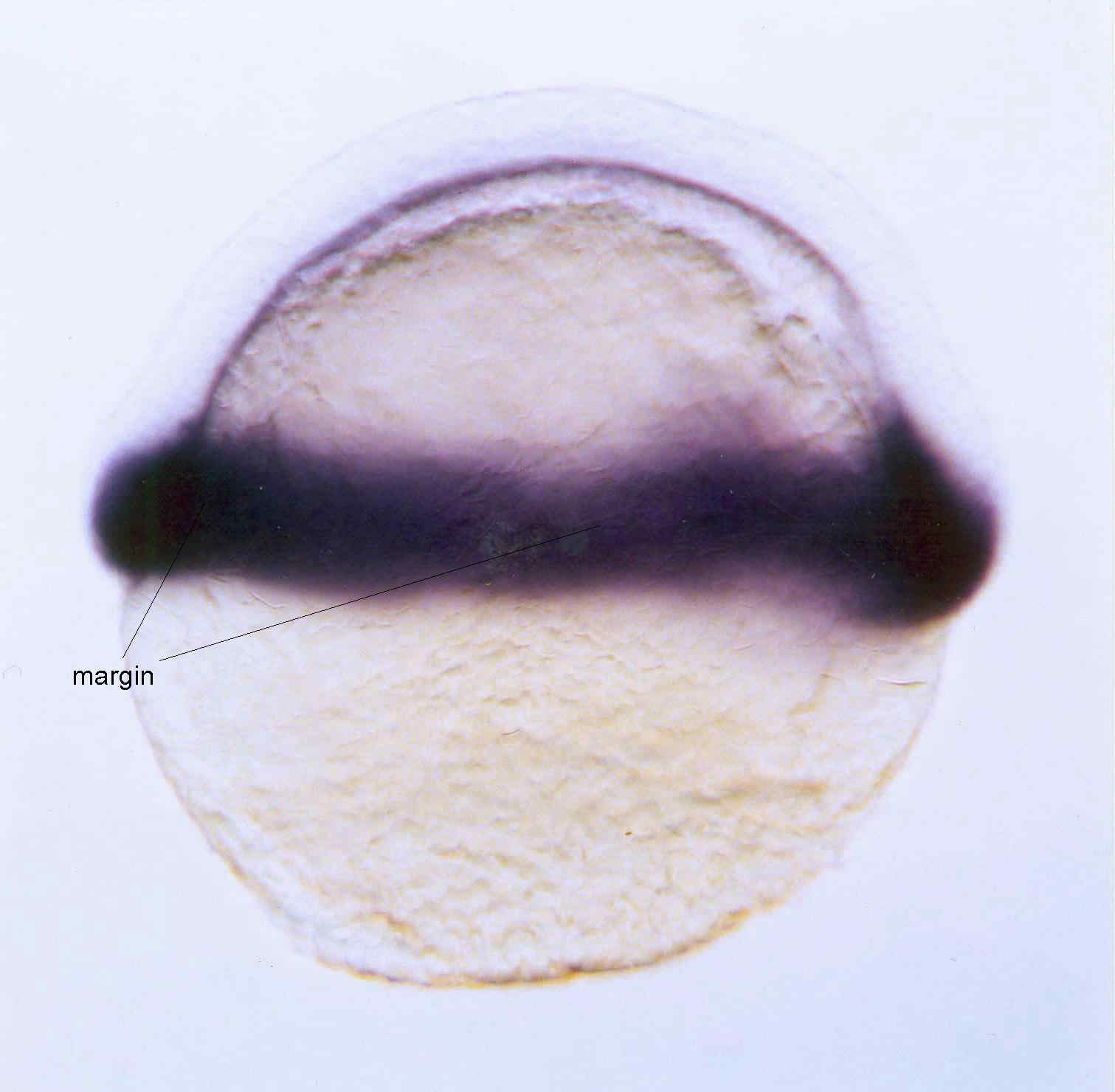 Fig. 2 Expression of snail1 is observed at the gastrula margin as well as in presumptive paraxial mesoderm. Snail1 transcript are excluded from the dorsal most territories (central part of the embryonic shield, axis)