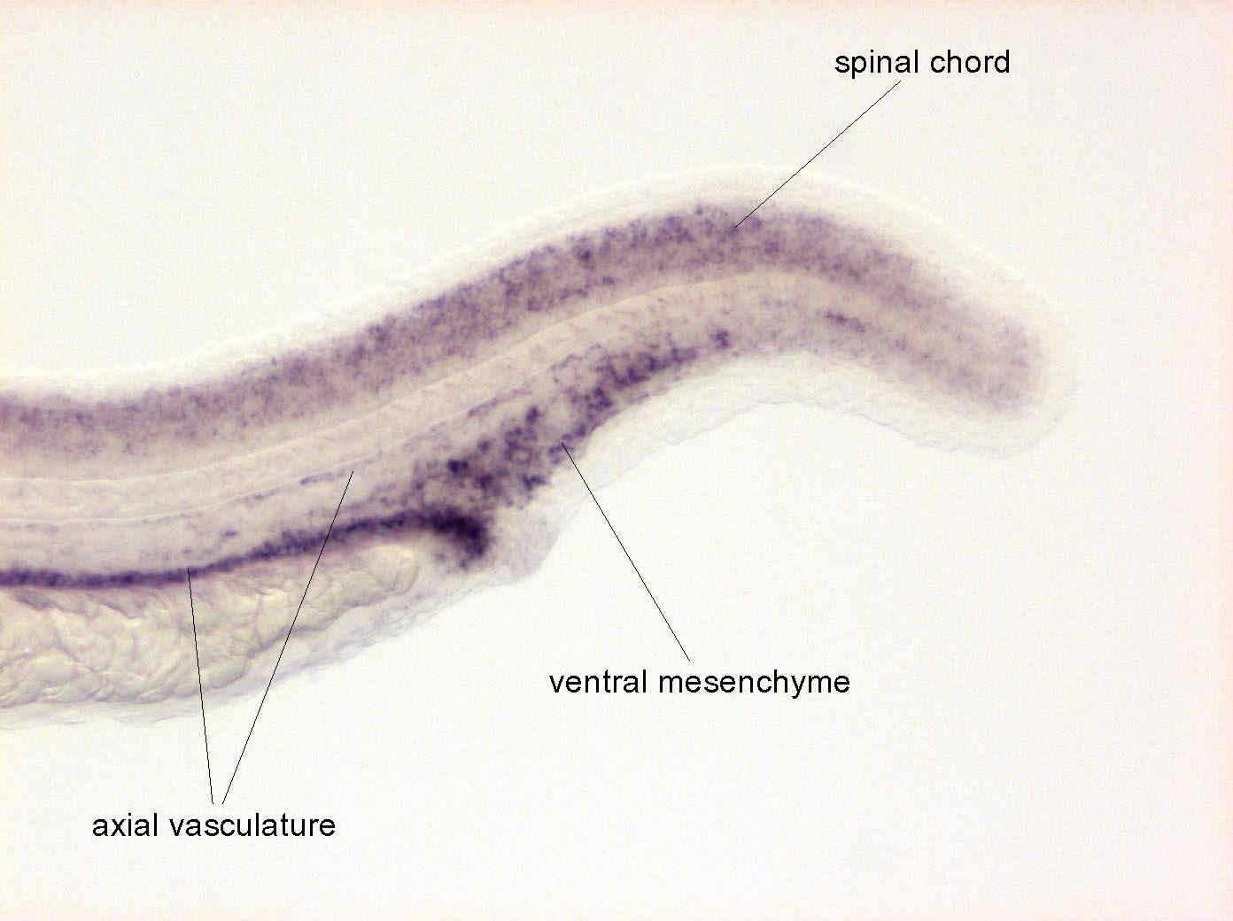 Fig. 4 Staining in ventral mesoderm is observed in axial vasculature and caudal vein