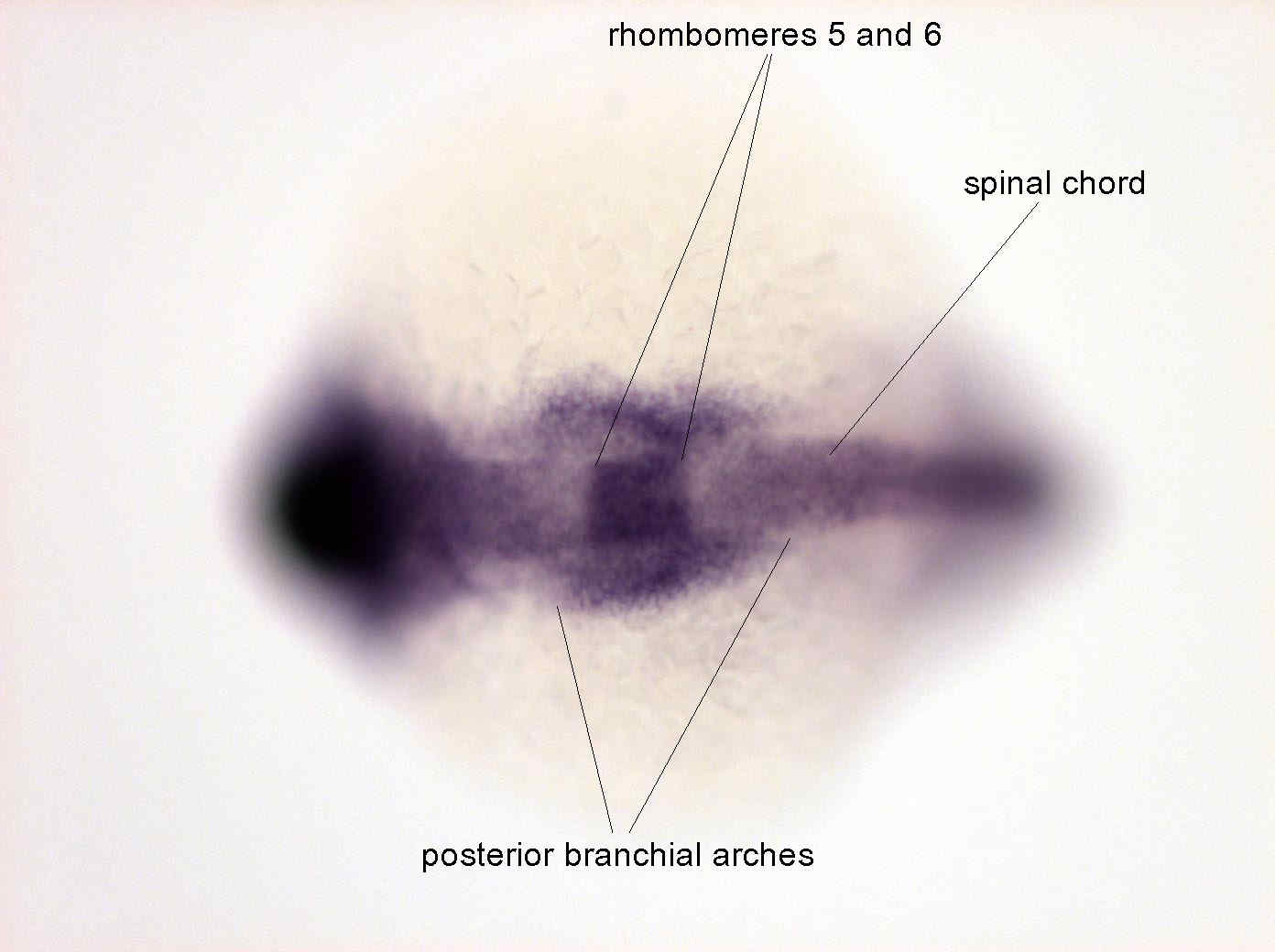 Fig. 3 In the hindbrain, labelling is specifically observed in rhombomere 2, 5 and 6