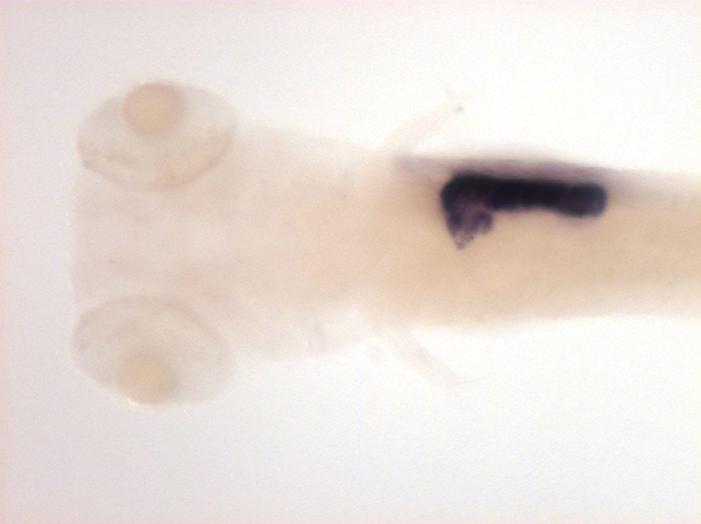 Please note that in 5 day old embryos some structures are not accessible to the probe (such as notochord, most of the trunk and tail). Therefore the description of the expression pattern is only partial.