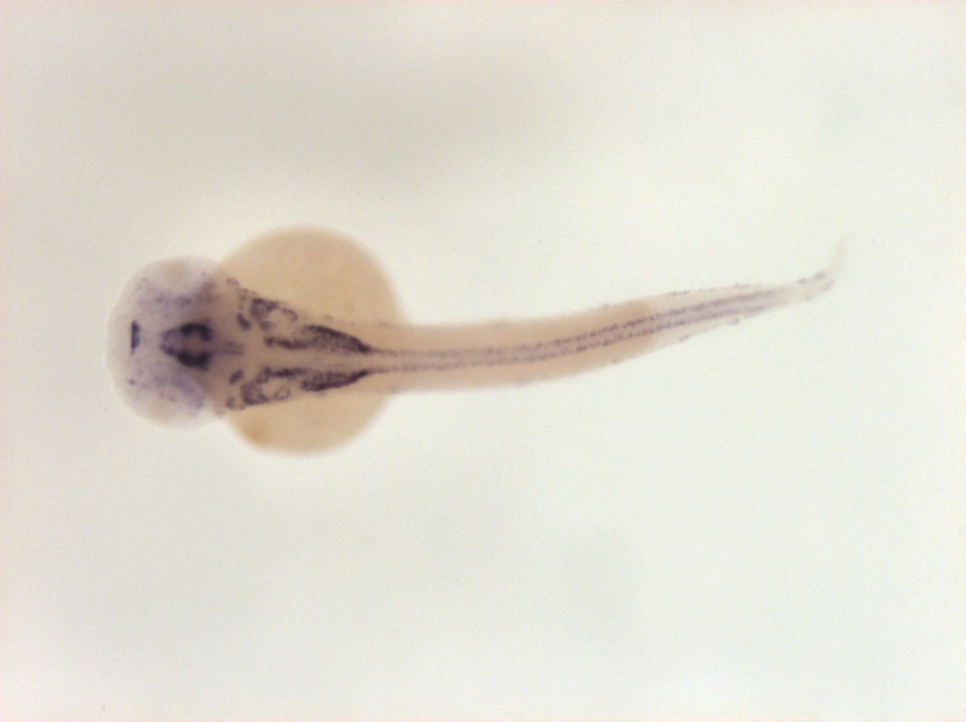 Fig. 6 strong in lateral line, anterior part of the otic vesicle, nucleus in ventral anterior hindbrain, neurons in dorsal and lateral hindbrain, spinal chord, ventral anterior diencephalon, ventral telencephalon