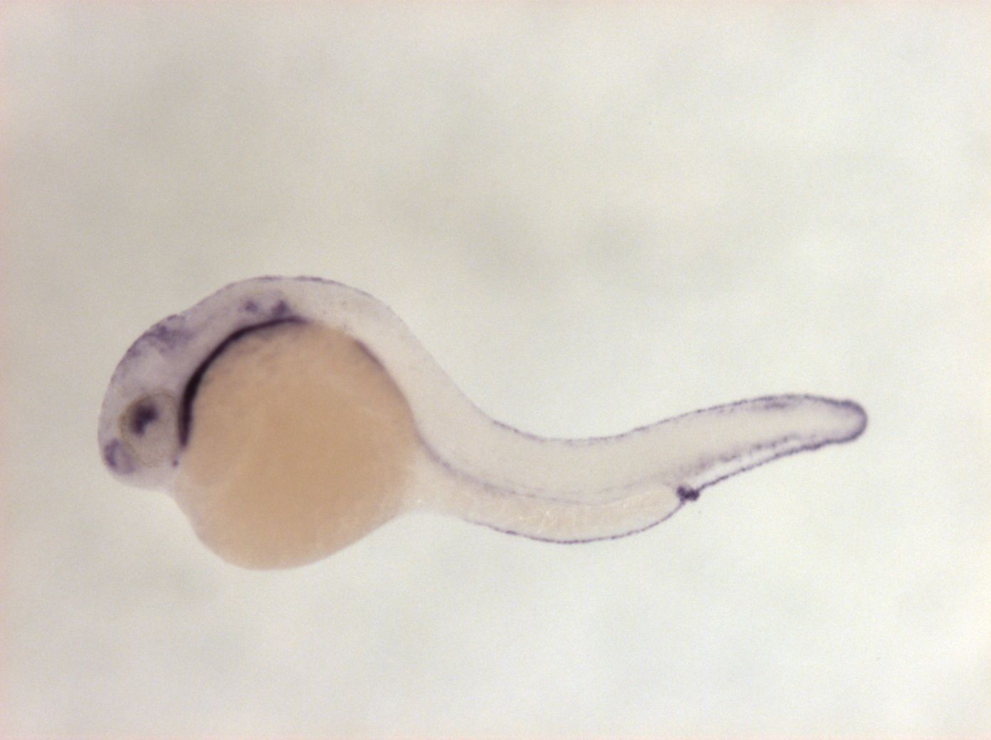 Fig. 4 nose, retina dorsal to the lens, heart, otic vesicle, pectoral fin, axial fin fold, anterior part of posterior lateral line, branchial arch vasculature, olfactory vesicle