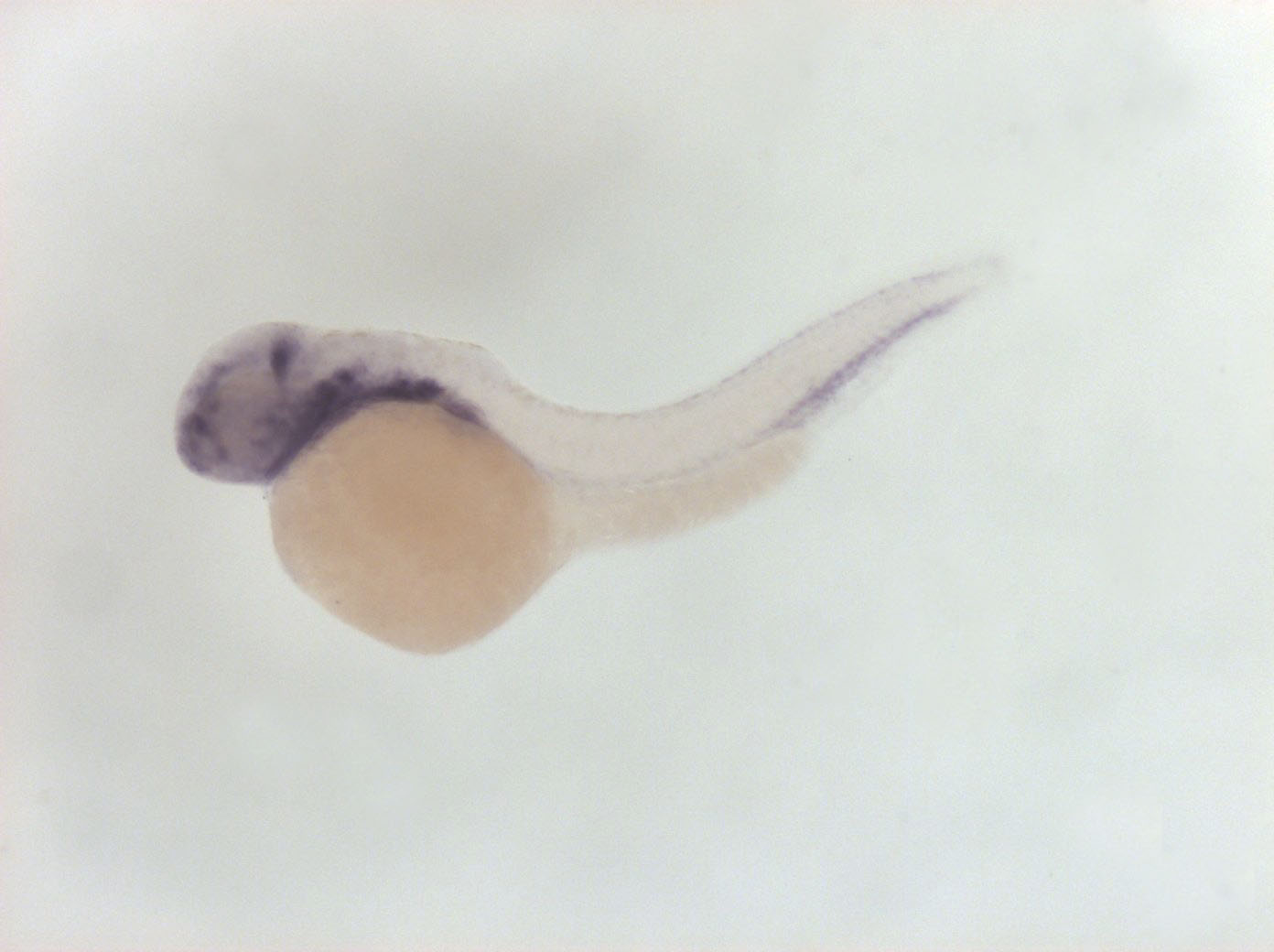 Fig. 5 olfactory vesicle, branchial arches ++, cranial ganglia, midbrain hindbrain boundary, ventral mesenchyme in the tail; pectoral fins