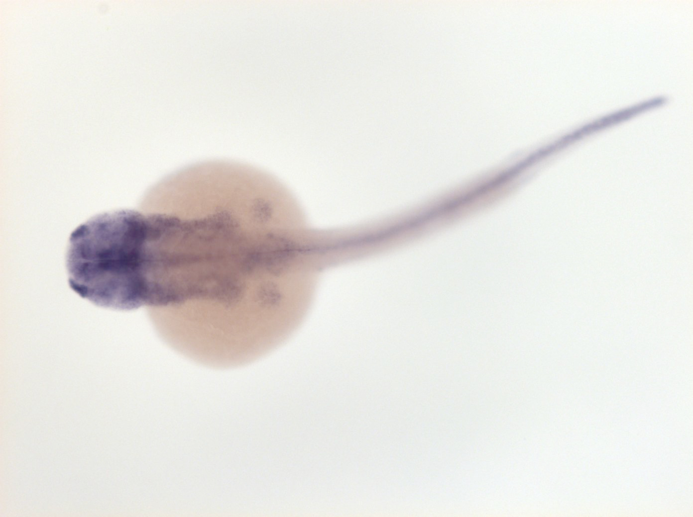 Fig. 5 More labelling in nose, part of forebrain and part of tegmentum, pronephric ducts and ventral part of the spinal chord