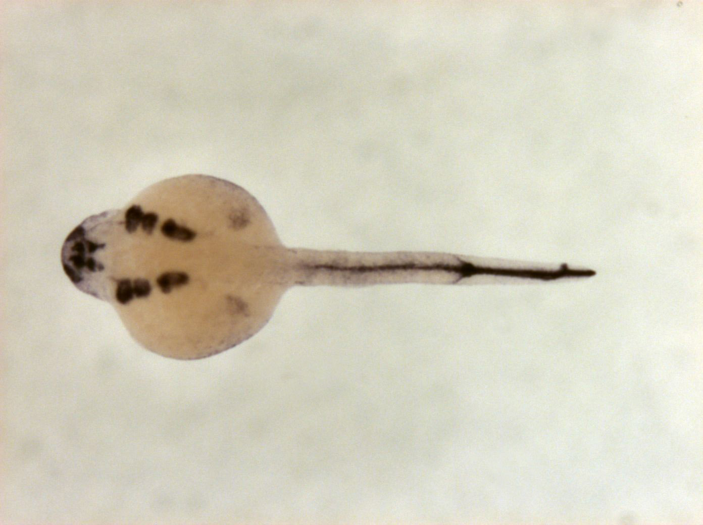 Fig. 4 median fin fold, otic vesicle, branchial arches (peripheral cells), olfactory placodes, telencephalon, anterior diencephalon, pectoral fin bud
