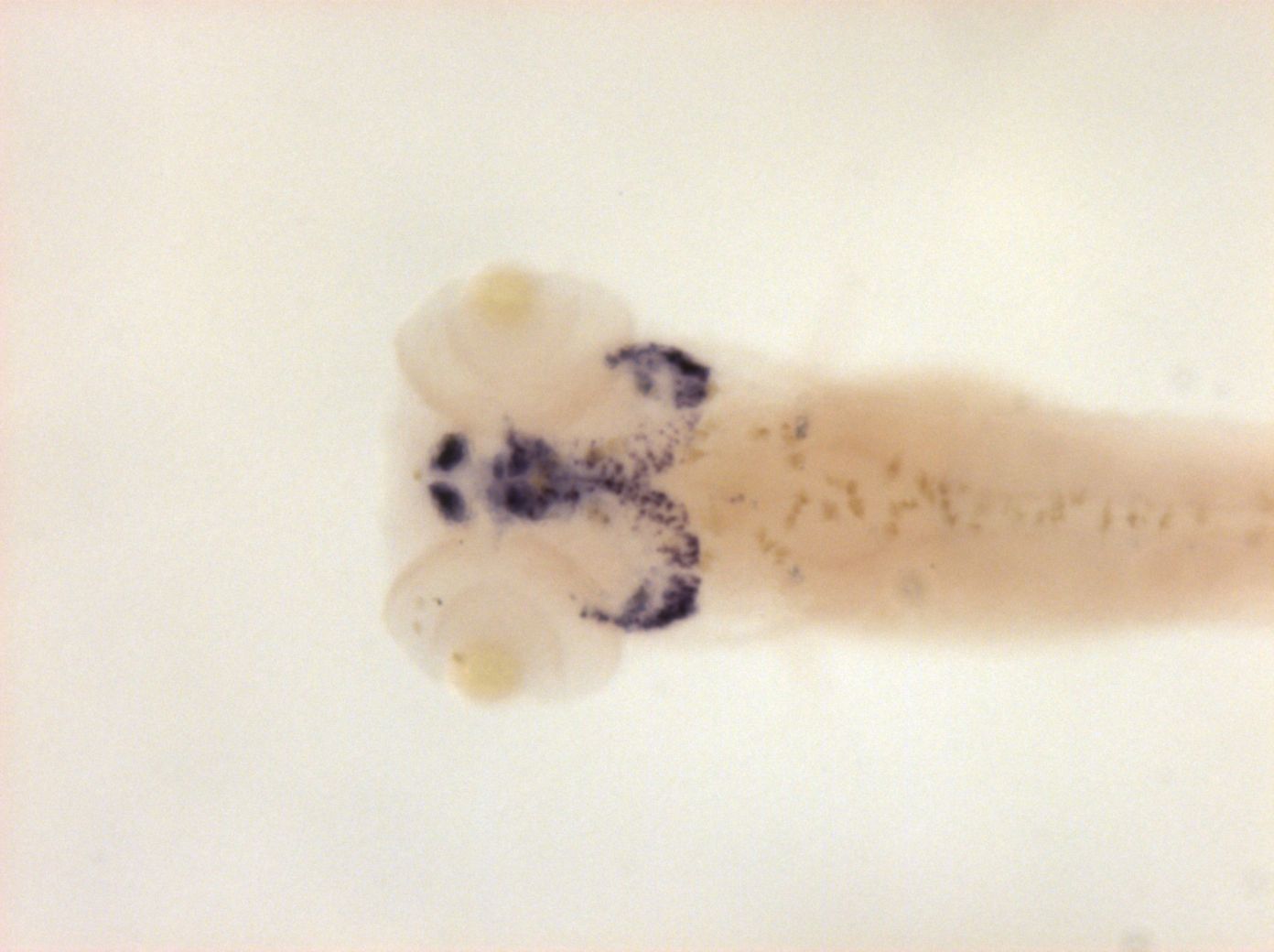 Please note that in 5 day old embryos some structures are not accessible to the probe (such as notochord, most of the trunk and tail). Therefore the description of the expression pattern is only partial.