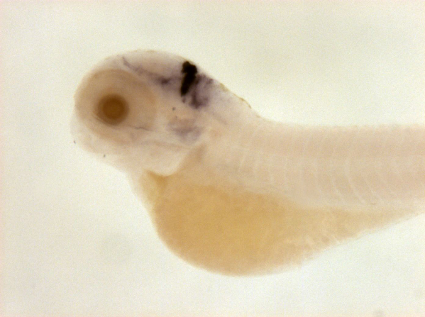 Please note that in 5 day old embryos some structures are not accessible to the probe (such as notochord, most of the trunk and tail). Therefore the description of the expression pattern is only partial.