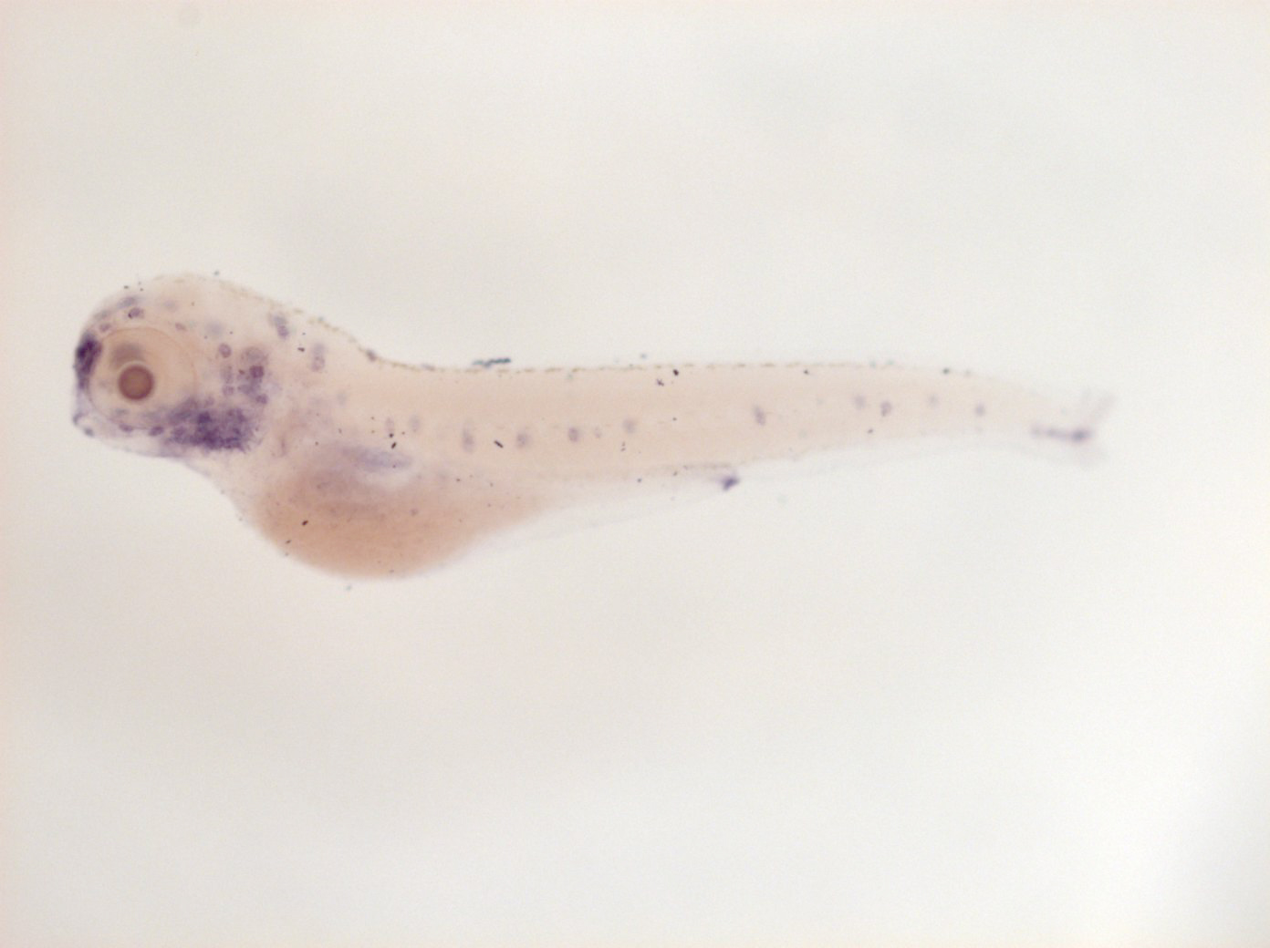 Please note that in 5 day old embryos some structures are not accessible to the probe (such as notochord, most of the trunk and tail). Therefore the description of the expression pattern is only partial.
