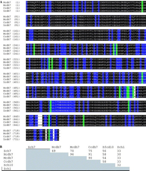 (A) Amino acid sequence comparison between the deduced zebrafish Cdh7 amino acid sequence (Zcdh7), chicken Cdh7 (Ccdh7), human Cdh7 (Hcdh7), and mouse Cdh7 (Mcdh7). Comparisons were between published sequences from the EC1 to near the end of the coding sequences. Residues that are identical among all four sequences are outlined in black. Residues conserved in three of four sequences are outlined in blue, while two of four outlined in green. (B) Sequence identity percentages for pairwise comparisons between zebrafish Cdh7, several other Cdh7 sequences, cadherin10 (Zcdh10, another type II zebrafish cadherin) and a type I zebrafish cadherin, cadherin1 (Zcdh1). Sequence comparisons were performed using Clustal W (Des Higgins, EBI, Hinxton Hall, UK). |