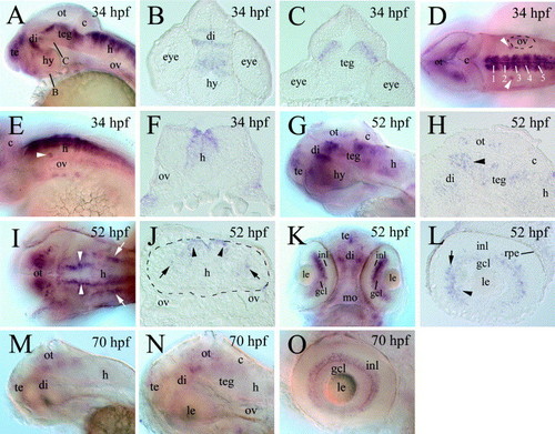 cdh7 expression in 34 hpf (A–F), 52 hpf (G–L), and 70 hpf (M–O) zebrafish embryos. (A, D, E, G, I, K, M–O) From whole mount embryos processed for cdh7 in situ hybridization, while the remaining panels are sections from embryos processed for cdh7 whole mount in situ hybridization. (A, G, M, and N) Lateral views of the head region (anterior to the left and dorsal up). (B and C) Cross sections (dorsal up) of the brain, with their section levels indicated by corresponding letters in (A). (D and I) Dorsal views (anterior to the left), while (E) is a lateral view (anterior to the left and dorsal up) of the hindbrain region. The white numbers in (D) indicate cdh7 expression swellings in the hindbrain. The arrowheads in (D and E) point to a pair of cdh7 expressing cell clusters in the ventral region anterodorsal to the otic vesicle. (F) Cross section (dorsal up) from the hindbrain. (H) Higher magnification of parasagittal section of the midbrain region. The arrowhead indicates cdh7 expressing cells in the pretectal region. The pair of arrowheads in (I) point to the dorsomedially located cdh7 expression domains, while the arrows indicate the ventrolaterally situated expression domains. (J) Cross section (dorsal up) from the hindbrain also showing the same cdh7 expressing domains (indicated by corresponding arrowheads and arrows) as in panel I. The hindbrain boarder in this panel is outlined by the dashed line. Panel K is a ventral view (anterior up) of the forebrain and eyes, while panel L is a parasagittal section (anterior to the left and dorsal up) of the retina. Panel N is a higher magnification of the head region in panel M, while panel O (anterior to the left and dorsal up) shows a lateral view of the eye. Abbreviations: gcl, retinal ganglion cell layer; hy, hypothalamus; inl, inner nuclear layer; mo, mouth; rpe, retinal pigmented epithelium; teg, tegmentum. Other abbreviations are the same as in previous figures. |