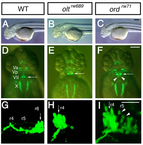olt and ord genes are required for migration of nVII motor neurons. (A-I) Morphology and Isl1-GFP expression of wild-type (A,D,G), MZ-oltrw689 (B,E,H) and MZ-ordrw71 (C,F,I) Isl1-GFP embryos at 48 hpf (A-F) and 30 hpf (G-I). In wild-type embryos (D,G), the nVII motor neurons are located in r6 (arrows). By contrast, in olt (E,H) and ord (F,I) embryos, most or all of the neurons are located in r4 (arrows). In ord embryos (F,I), some neurons migrate into r5 (arrowheads). (A-C,G-I) Lateral views; anterior facing left. (D-F) Dorsal views; anterior at the top. (A-F) Images obtained using a dissecting microscope. (G-I) Composite images of serial optical sections obtained by confocal microscopy. Va, anterior trigeminal nuclei; Vp, posterior trigeminal nuclei; VII, facial nucleus; X, vagus nucleus. Scale bars: 50 μm. The images in A,C,D,F,G,I were previously published in Wada et al. (Wada et al., 2005) |