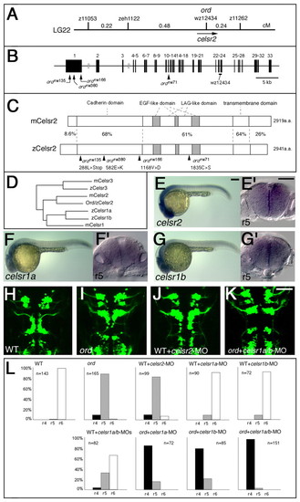 Identification of the ord gene as zebrafish celsr2 gene. (A) Genetic map of the ord locus. (B) Genomic structure of the zebrafish celsr2 gene. The nucleotide substitution resulting from each mutation is indicated. (C) Schematic drawings of the mouse and zebrafish Celsr2 proteins. Amino acid sequence similarity (%) is shown for each domain. The amino acid substitution resulting from each mutation is indicated. (D) The phylogenetic tree for celsrfamily genes. (E-G) Lateral views of wild-type embryos reacted with RNA probes for celsr2 (E), celsr1a (F) and celsr1b (G) at 24 hpf. (E',F',G') Cross sections at r5 for each embryo, E-G, respectively. (H-K) A wild-type Isl1-GFP embryo injected with celsr2-MO (J) shows incomplete disruption of the neuronal migration as observed in an ord embryo (I). (K) An ord mutant embryo injected with celsr1a/1b-MOs shows complete loss of migration of the nVII motor neurons. The embryos are shown in dorsal view and the images are composite stacks of serial optical sections. (L) The neuronal migration phenotype in each experiment was scored as follows: r4, complete loss of migration, as shown in K; r5, partial disruption of migration, as shown in I; and r6, normal migration, as shown in H. Scale bars: 50 μm. |