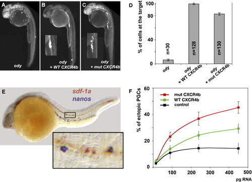 Examples of Faulty Arrival of PGCs to the Sites of sdf-1a Expression. PGCs are labeled by nanos-1 in blue, whereas sdf-1a RNA is labeled in red. The insets show sdf-1a expression at the positions where ectopic PGCs are found. |
