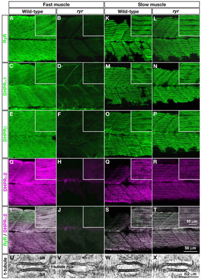 E-C-coupling components are dramatically decreased in ryr fast muscles. (A-H,K-R) The distribution of RyRs and DHPRs were assayed in fast and slow muscles at 48 hpf with anti-RyR (A,B,K,L), anti-DHPRα1 (C,D,M,N), anti-DHPRß (E,F,O,P) and anti-α2 (G,H,Q,R). Wild-type fast muscles express RyR (A), DHPRα1 (C), DHPRß (E) and DHPRα2 (G) in a striated pattern that presumably corresponds to the t-tubule-SR junctions, whereas clustering is not observed in mutant fast muscles (B,D,F,H). Wild-type slow muscles express RyR (K), DHPRα1 (M), DHPRß (O) and DHPRα2 (Q) in a striated pattern, as in wild-type fast muscles. ryr mutant slow muscles also express RyR (L), DHPRα1 (N), DHPRß (P) and DHPRα2 (R) in a striated pattern. (I,J,S,T) RyR (green) and DHPRα2 (purple) are colocalized in wild-type fast (I) and slow (S) muscle and in mutant slow muscle (T) but not in ryr mutant fast muscle (J). Insets show a higher magnification of muscle fibers. (U-X) Electron micrographs of t-tubule-SR junctions in muscles at 48 hpf. Putative RyR-DHPR aggregates are visible as dense particles between t-tubule and SR membranes in wild-type fast muscle (U) but not in ryr mutant fast muscle (V). The RyR-DHPR aggregates are present in both wild-type (W) and mutant (X) slow muscles. SR, sarcoplasmic reticulum. PHENOTYPE: