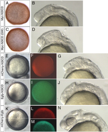 Validation of Gateway compatible N-term pCS vectors. A,B: Embryo injected with myc-notch3icd mRNA from plasmid generated through standard ligation-mediated cloning. C,D: Embryos injected with myc-notch3icd mRNA from plasmid generated through Gateway cloning (GW). A,C: Embryos fixed at 50% epiboly and immunostained to detect the myc epitope; dorsal view. B,D: Live embryos at 26 hpf, lateral view, anterior to the left. E-G: Embryos injected with mRNA encoding mCherry-Notch3ICD. H-J: Embryos injected with mRNA encoding Egfp-Notch3ICD. K-N: Embryos injected with mRNA encoding an mCherry-Egfp fusion. E,H,K: Dorsal views at 50% epiboly, images generated under standard transmitted light illumination of live embryos. F,L: Visualization of red fluorescence at 50% epiboly, dorsal views. I,M: Visualization of green fluorescence, dorsal views at 50% epiboly. G,J,N: Lateral views under transmitted light, dorsal is up, anterior to the left. All embryos injected with 100 pg of indicated mRNA. N3ICD, notch3 intracellular domain.  |