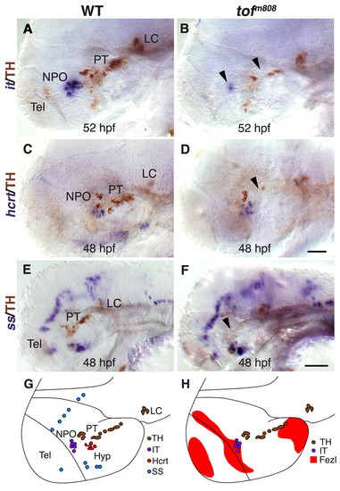 Analysis of hypothalamic neurons in fezl/tofm808 mutant embryos. (A-F) Heterozygous (WT; A,C,E) embryos and their too fewm808 (tofm808) mutant siblings (B,D,F) were fixed at 52 (A,B), and 48 (C-F) hours post fertilization (hpf) and subjected to whole-mount in situ hybridization with antisense RNA probes directed against either the hypothalamic neuropeptide isotocin, which is the zebrafish ortholog of oxytocin (it; A,B), hypocretin/orexin (hcrt; C,D) or somatostatin (ss; E,F). After probe color development, all specimens were subjected to immunostaining with an anti-tyrosine hydroxylase (TH) antibody to detect DA neurons. WT heterozygous and tofm808 embryos were scored by TH staining followed by sequencing-based genotyping. Black arrowheads indicate deficiencies in DA and IT neurons in too few embryos. (G,H) SchCsup>m808 embryos were scored by TH staining followed by sequencing-based genotyping. Black arrowheads indicate deficiencies in DAematic representations of the examined hypothalamic cell types and of fezl/tof expression domains in a 2-day-old WT embryo. All panels show lateral views of the embryo, anterior to the left. Hyp, hypothalamus; LC, locus coeruleus; NPO, neurosecretory preoptic area; PT, posterior tuberculum; Tel, telencephalon. Scale bars: 50 μm in A-D; 100 μm in E,F. |