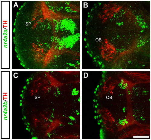 nr4a2 genes and TH are not co-expressed in the DA neurons of the olfactory bulb and subpallium. (A-D) Confocal z-projections of whole mount FISH to nr4a2a (A-B, green) or nr4a2b (C-D, green) combined with anti-TH immunohistochemistry (red). Neither nr4a2a nor nr4a2b is co-expressed with TH in the DA neurons of the subpallial area (A, C) and of the olfactory bulb (B, D). Dorsal views are presented, anterior is to the left. Scale bar: 50 μm. |