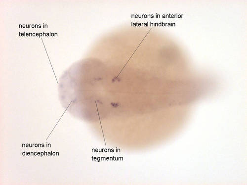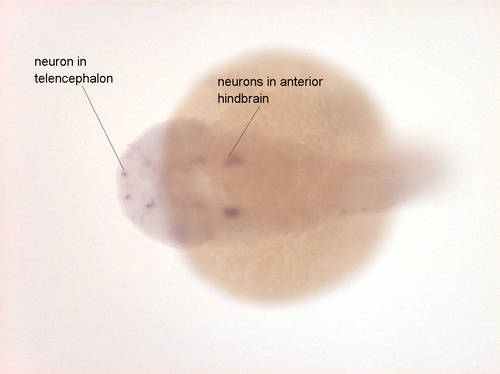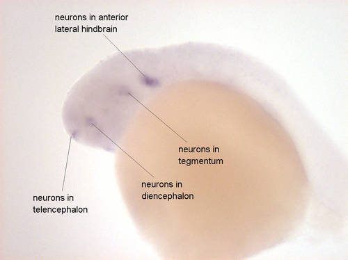 Expressed in neurons of telencephalon, diencephalon, tegmentum and anterior lateral hindbrain EXPRESSION / LABELING: