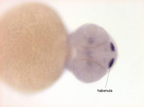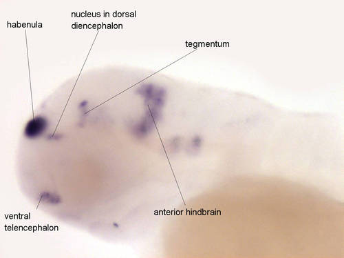 Expressed in ventral telencephalon, in habenula, tegmentum, anterior hindbrain and in posterior hindbrain and anterior spinal chord |
