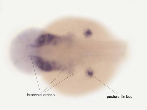 Expressed in branchial arches (stronger in anterior branchial arches) and in pectoral fin cartilage. |