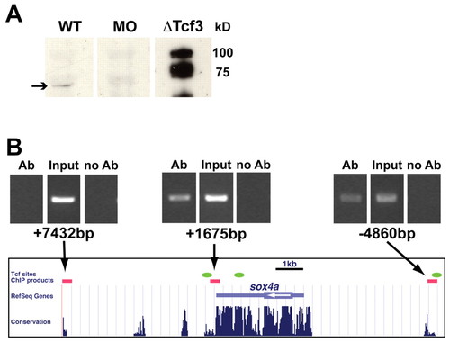 Tcf3 binds to regulatory regions of sox4a in vivo. (A) A Tcf3a polyclonal antibody detects a specific band that is absent from tcf3 morphants, and detects larger bands in ΔTcf3-expressing embryo lysates. Multiple bands are most likely to be due to rearranged copies of the transgene. (B) ChIP analysis of whole-embryo lysates shows specific immunoprecipitation of two phylogenetically conserved DNA fragments in regulatory regions of sox4a. A third fragment, lacking nearby Tcf sites, does not precipitate. The conservation plot is adapted from the UCSC Genome Browser. ChIP fragments are indicated by red bars and potential Tcf-binding sites in conserved regions are indicated by green ovals |