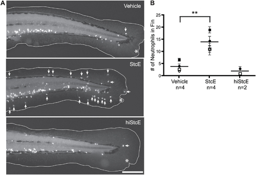 StcE induces mislocalization of zebrafish neutrophils. (A) Zebrafish embryos at 3 dpf were wounded in the ventral fin in the presence of 25 μg/mL StcE, hiStcE, or vehicle control and fixed after 24 hours for whole-mount immunofluorescence with anti-mpo staining. Arrows indicate abnormal localization of neutrophils in the fin of StcE-treated zebrafish. The edge of the fin is outlined in white, and the site of the wound is indicated by an asterisk. The scale bar represents 200 μm. (B) Images from independent experiments were blinded and the number of neutrophils in the fin counted. Data are shown as means of individual experiments (shapes)±S.E.M. and total combined mean (bars); **, p<0.01 of combined means by one-way ANOVA with Dunnett's post test. EXPRESSION / LABELING: