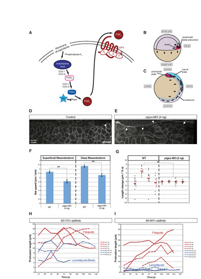 Qualitative and quantitative analysis of cell migration in Ptges-deficient embryos during gastrulation. (A) Schematic of PGE2 synthesis. Blue star, location of pathway inhibition by MO. COX, Cyclooxygenase-/Prostaglandin-endoperoxide synthase type 1 and 2; PGG2, Prostaglandin G2; PGH2, Prostaglandin H2; PGE2, Prostaglandin E2; MO, antisense morpholino oligonucleotide; Ptges, Prostaglandin E synthase; EP4, E-prostanoid 4 receptor. (B,C) Schematic of gastrulation movements in zebrafish at the shield (B) and tailbud (C) stages. (D,E) Protrusive activity of axial mesodermal cells undergoing epiboly (yolk cell-embryonic cell margin) in control (D) and tailbud (E) embryos. Arrowhead, blebbing activity. (F) The net speed (µm/minute) of superficial and deep mesendodermal cells in control embryos and ptges morphants. **, P<1×10-4. (G) Quantitation of the length changes (µm/15 seconds) of four prechordal mesoderm cell protrusions per sample during the time-lapse. Cellular protrusions from ptges morphants show less extension and retraction than those from control embryos (*, P=0.03). Red line, average protrusion length. (H,I) Protrusion length in prechordal mesoderm cells migrating anteriorly towards the animal pole. Four protrusions (embryo 1, solid lines; embryo 2, dashed lines) were analyzed in control (red) and ptges (blue) morphant gastrulae at 60-75% (H) and 80-90% (I) epiboly during time-lapse imaging. Control morphant protrusions are filopodia (length>width; diameter<2 μm), whereas ptges morphant protrusions exhibit lamellipodial (width>length; length>2 μm) or bleb-like characteristics (Montero et al., 2003). |