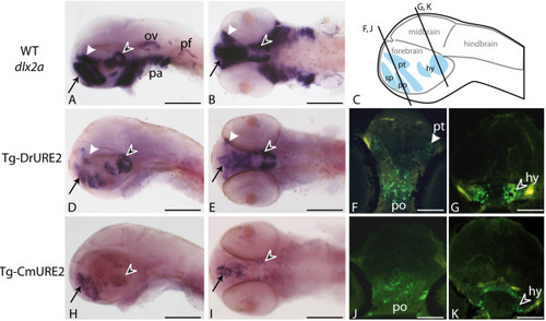 Expression of URE2-GFP reporter constructs in the brain of 48 hpf zebrafish. Expression patterns obtained by in situ hybridization using a dlx2a cDNA probe in wild-type embryos (A, B) or a GFP probe in Tg-DrURE2 (D, E) and in Tg-CmURE2 embryos (H, I). Immunolocalization of GFP proteins on sectioned embryos of the Tg-DrURE2 (F, G) and Tg-CmURE2 (J, K). Expression in the telencephalon is comparable for the endogenous gene and the two transgenes (black arrow in A, B, D, E, H, I). Expression in the dorsal domain of the prethalamus (white arrowhead) in Tg-DrURE2 for gfp mRNA (D, E) and GFP proteins (F) is not observed in Tg-CmURE2 (H-J). Expression of GFP in the hypothalamus (black arrowhead) was restricted to lateral cells in Tg-CmURE2 (H, I, K) compared to Tg-DrURE2 (D, E, G). Panels A, D, H are lateral views, B, E, I are ventral views. Plan for the transversal sections presented in F-G and J-K are localized on the scheme in panel C. Blue domains in the scheme are the forebrain expression domains described for dlx genes: the telencephalic domain being the subpallium (sp, black arrow); the diencephalic domains being the preoptic area (po), prethalamus (pt, white arrowhead) and hypothalamus (hy, black arrowhead). Scale bars: A, B, D, E, H, I, 250 μm; F, G, J, K, 50 μm. EXPRESSION / LABELING: