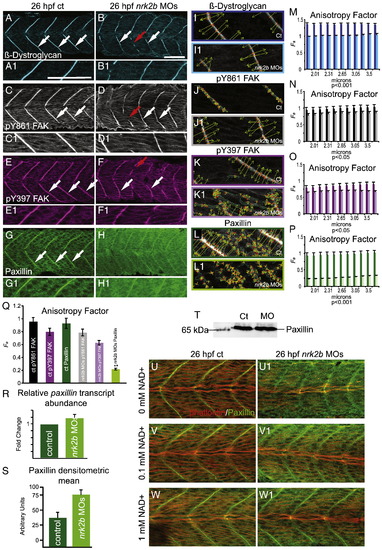 Nrk2b is required for normal subcellular localization of Paxillin, but not β-Dystroglycan or FAK. (A–H) Side mount, anterior left, dorsal top, 26 hpf. Panels A, C, E, and G are controls. Panels B, D, F, and H are nrk2b morphants. Panels numbered 1 are magnifications of the corresponding lettered panels. (A–B1) β-Dystroglycan antibody staining. (C–D1) pY861 FAK antibody staining. (E–F1) pY397 FAK antibody staining. (G–H1) Paxillin antibody staining. White arrows indicate normal localization of proteins to MTJs. Red arrows in nrk2b morphants (B, D, F) indicate discontinuous MTJs crossed by muscle fibers. Note that in nrk2b morphants (H, H1), Paxillin does not robustly concentrate to MTJs. (I–L) Side mount, anterior left, dorsal top, 26 hpf controls (lettered panels) and nrk2b morphants (numbered panels). Application of 2D WTMM method showing maxima chains (dark green), nodes (red), and vectors (light green) for CMAC component antibody staining. (M–Q) Graphs of anisotropy or the amount of order in a structure over a range of applicable size scales. (R) qRT-PCR, (S) average densitometric mean of Paxillin antibody-stained images and (T) Western analysis suggest that Paxillin levels are not decreased in nrk2b morphants. (U–W) Side mount, anterior left, dorsal top, 26 hpf embryos, phalloidin staining in red, Paxillin antibody staining in green. Lettered panels are controls and numbered panels are nrk2b morphants. (Panel U) No exogenous NAD+. (Panel V) 0.1 mM exogenous NAD+. (Panel W) 1 mM exogenous NAD+. Note that exogenous NAD+ treatment rescues medial Paxillin concentration at the MTJ in nrk2b morphants in a dose dependent manner. Scale bars are 50 μm. |