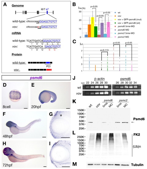 The vov mutant gene encodes Psmd6. (A) Nucleotide substitution from G to A occurs in a splicing acceptor site of the intron6/7-exon7 boundary (top, underlined), causing a one-base deletion in the psmd6 mRNA that results in a frameshift within the coding region (middle panel) and loss of the PCI domain (bottom panel). (B,C) Ina (B) and Inf (C) of wild type, vov mutant, vov mutant injected with GFP-tagged psmd6 RNA carrying the vov mutation, vov mutant injected with wild-type GFP-tagged psmd6 RNA, psmd6 and psmc2 morphants and their five-mismatch morphants. Ina is lower and the maximum value of Inf is higher in the vov mutant injected with wild-type GFP-tagged-psmd6 RNA (green) than in the vov mutant injected with GFP-tagged-psmd6 RNA carrying the vov mutation (yellow), suggesting that wild-type psmd6 RNA injection rescues the vov-mediated defects in nuclear position and shape of lens fiber cells. Ina is higher and the maximum value of Inf is lower in psmd6 (purple) and pmsc2 morphants (pink) than in their five-mismatch morphants (brown and light blue), suggesting that these MOs induce the vov-like lens defects. (D-I) Expression of zebrafish psmd6 mRNA at the eight-cell stage (D) and at 20 (E), 48 (F,G) and 72 hpf (H,I). (G,I) Plastic sections of eyes. Asterisk indicates psmd6 expression in the retinal CMZ. (J) Semi-quantitative PCR of wild type and vov mutant at 72 hpf using psmd6 and β-actin gene primers. The number of PCR cycles is indicated above each lanes. (K-M) Western blotting of 72 hpf wild type, vov mutant, psmd6 and psmc2 morphants and their five-mismatch morphants with anti-zebrafish Psmd6 (K), anti-polyubiquitylated protein (FK2) (L) and anti-acetylated α-tubulin (M, a loading control). The level of Psmd6 (arrow) is reduced in the vov mutant and psmd6 morphant, but is unaffected in the psmc2 morphant (K). The levels of polyubiquitylated proteins increase in the vov mutant, psmd6 and psmc2 morphant (K). Scale bars: 250 µm in D-F,H; 50 µm in G,I. EXPRESSION / LABELING: