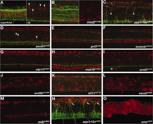 Spinal cord radial glial mutants. A-O: Lateral views of the trunk, anterior left. A: Wild-type spinal cord showing axon bundles (green) and radial glia (red) observed in a full maximum intensity projection (superficial, left panel). The typical placement and number of Gfap-labeled radial glial cell bodies at the ventricular zone (arrowheads) is seen in a projection of optical slices encompassing the full ventricular zone (“VZ”, right panel). B:rrm2 mutants had axonal and astroglial phenotypes characteristic of nonspecific defects that are likely caused by ubiquitous cell death. Right half shows only the channel for αGfap labeling (red), while the left half also includes αAT labeling for axons. C-O: Mutants with altered numbers of αGfap-labeled cell bodies within the spinal cord. C,D:ppp1r12a and pou5f1 mutants had reduced numbers of αGfap-labeled cell bodies (arrowheads) near the ventricular zone (A; see also Fig. 1E). E-H:gnl3, twistnb, utp11 and mak16 mutants had no αGfap-labeled cell bodies in the ventricular zone. I-L: In contrast, arnt2 mutants had ectopic Gfap+ cell bodies in the floorplate (I), and wnt5b, kif11, and esco2 mutants had increased numbers of Gfap+ cell bodies in the ventricular zone (J-L). M-O:mib, ppp1r12a, and smo mutants all had fewer or no αGfap-labeled cell bodies and radial glial processes. mib mutants had no radial glial processes except in the regions of the roof- and floorplates (M, brackets). N: In ppp1r12a mutants, aberrant axons projections were associated with ectopic dorsal clusters of radial processes (arrows). O: smoothened mutants had no αGfap-labeled cell bodies and generally disorganized radial glial processes. PHENOTYPE: