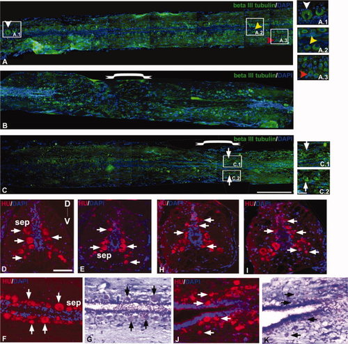 Immunohistochemical staining of β-III tubulin (A-C), Hu (D–F and H-J), and counter-staining of Luxol fast blue/Cresyl violet (G and K) in zebrafish uninjured (A, D–G) and injured spinal cord (B,C, and H–K). A: Section of uninjured cord shows the spatial distribution of different types of neurons sensory neurons (white ▼), interneurons close to ependyma (yellow ▼), and motorneurons (red ▼). A.1, A.2, A.3: Higher magnification of indicated areas of A showing different types of neurons. B: 3dpi cord section showing the loss of mature neurons at the injury epicenter. C: One month post-injured cord section showing regenerated neurons at the injury epicenter. C.1, C.2: Higher magnification of indicated areas in C, where formation of new neurons (thick arrow) both at the dorsal and ventral sides can be seen. D–F: Sections of uninjured cord showing the distribution of Hu+ neurons (thick arrow) in the subependyma (sep) along the D-V axis. G: Luxol fast blue/Cresyl violet staining of F. H–J: Sections from 10dpi cord showing the presence of Hu+ newly formed neurons (thick arrow) in different locations along the D-V axis. K: Staining of the same section in J with Luxol fast blue/Cresyl violet. Scale bar = 250 μm (A-C), 50 μm (A.1-A.3, C.1,C.2, D-K). |