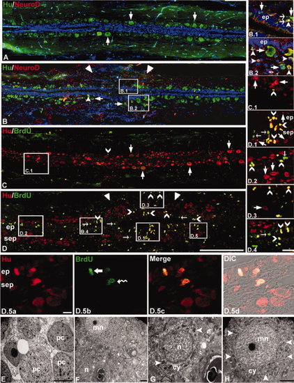 Immunohistochemical localization of Hu, NeuroD, and BrdU (A-D) and ultrastructural analysis (E-H) in zebrafish spinal cord. A: Uninjured spinal cord shows the presence of many Hu+ cells (thick arrow) in subependyma, which are NeuroD-. B: The 10dpi cord section shows Hu+ cells (thick arrow) at the injured site (▼▼) and a few of these are NeuroD+ (▲). B.1, B.2: Higher magnification of indicated areas in B showing both populations of cells in the injury epicenter and the immediate adjacent part, respectively. Note that newly generated neurons extend projections (side arrow). C: Uninjured cord showing many subependymal Hu+ cells (thick arrow) and very few of them are BrdU+ (∨). C.1: At higher magnification, the same section as in C showing both Hu+/BrdU- cells (thick arrow) and Hu+/BrdU+ cell (∨). D: The 7dpi cord section shows only BrdU+ cells (→) both at the injury epicenter and in the immediate adjacent part of the epicenter. In both these regions, the number of Hu+/BrdU+ cells (∨) are higher than the normal uninjured cord and are also present close to the pial membrane at the injured site (▼▼). D.1-D.4: Same as D at higher magnification showing the presence of Hu+/BrdU+ (∨), Hu+/BrdU- thick arrow), and Hu-/BrdU+ (thin arrow) cells in the injury epicenter (D.1), adjacent normal part (D.2), subpial location (D.3), and the immediate adjacent part of epicenter (D.4) respectively. D.5: Represent the presence of both slow (bold arrow) and fast (squiggly arrow) population (D.5b) of Hu+ cells in both ependyma (ep) and subependyma (sep) (D.5a) and their respective merge (D.5c) and DIC (D.5d). E: 10dpi cord showing dividing neuronal progenitor cells (pc) at the injury site. F: One-month post-injured cord shows the presence of both newly formed neuron (n) and specified motor neuron (mn). G: Higher magnification picture of newly formed neuron (n) with a small cytoplasmic area (cy) and a few cytoplasmic organelles (white arrowhead). H: Higher magnification picture of specified motor neuron with a large volume of cytoplasm and many cytoplasmic organelles (white arrowhead). Scale bar = 200 μm (A-D), 20 μm (B.1-D.3), 10 μm (D.4), 2 μm (E-H). |