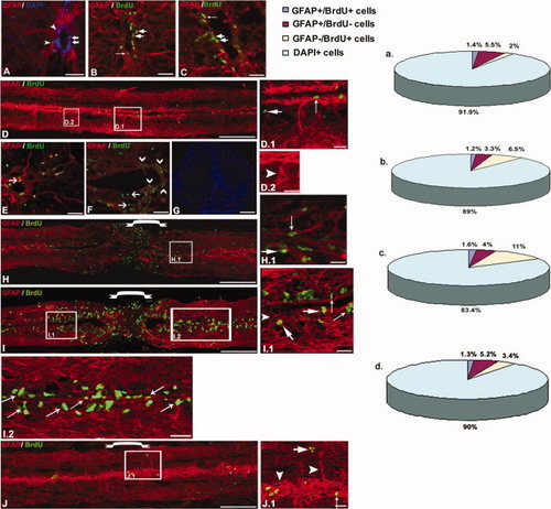 Immunohistochemical staining of GFAP and BrdU in zebrafish uninjured (A,B, D,E, D.1, and D.2) and injured (C, F, H-J, H.1, I.1, and J.1) spinal cord. A, B: Uninjured cord section showing that a percentage of DAPI+ cells are GFAP+ radial glia (arrowhead) and the presence of BrdU+ cells (thick arrow) around the central canal; some colocalize with GFAP (→). C: 7dpi cord section shows an greater number of BrdU+ cells around the central canal than normal; a few colocalized with GFAP (→). D: Uninjured cord showing high GFAP expression and the presence of few BrdU+ cells. Same cord at a higher magnification showing different radial glial population, GFAP+/BrdU+ (↑) and GFAP-/BrdU+ (thick arrow) cells (D.1) and GFAP+/BrdU- cells (▼) (D.2), respectively. E: Ependyma of uninjured cord showing many more slow-dividing cells (→), some of which are radial glia and a few fast-dividing cell. F: 7dpi cord representing many BrdU+, fast-dividing cells that are GFAP- (∨) and fewer slow-dividing cells (→) around ependyma. G: Control section stained without GFAP primary antibody. H: 3dpi cord, showing proliferating BrdU+ cells; only some are GFAP+. Also shown is a loss of GFAP expression at the injury epicenter ([down-bracket]) and at an immediately adjacent part of the cord. H.1: Same cord as in H at higher magnification showing both GFAP+/BrdU+ (↑) and GFAP-/BrdU+ (thick arrow) cells. I: 7dpi cord showing high proliferation, a low level of GFAP expression at the injury epicenter, and little higher level of GFAP expression at the immediate adjacent area. I.1: Same cord at higher magnification shows presence of GFAP+/BrdU+ (↑), GFAP-/BrdU+ (thick arrow) and GFAP+/ BrdU- (▼) cell populations. I.2: Same cord shows the presence of many GFAP+/BrdU+ (↑) cells. J: Fifteen-day regenerated cord shows a reduced BrdU incorporation but a high level of GFAP expression in both the uninjured part and the injury epicenter. J.1: Same section at higher magnification also represents three populations. a-d: The pie chart represents the percentage of three cell populations and DAPI+ cells in adult uninjured (a), 3dpi (b), 7dpi (c), and 15dpi (d) cord, respectively. Scale bar = 250 μm (D and H–J), 20 μm (A-C, E-G, D.1-J.1). |
