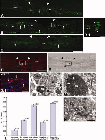 TUNEL staining (A-C), caspase-3 immunohistochemistry (D-E), ultrastructural analysis (F-H), and quantification of caspase-3 (I) in injured zebrafish spinal cord. A: The 6-hr post-injured spinal cord section shows the presence of apoptotic TUNEL-positive cells (thin arrow) both at the injury epicenter (▼▼) and immediate adjacent part. B: The 1dpi cord shows many TUNEL-positive cells (thin arrow) close to the injury epicenter. B.1: The higher magnification picture of B shows many apoptotic cells (thin arrow) and a cell with fragmented nuclear matter (up white arrowhead). C: The 3dpi cord section shows less TUNEL-positive cells (thin arrow) compared to 1dpi cord. D, E: 1dpi cord section shows the presence of many caspase-3-positive apoptotic cells (thin arrow) at the injury epicenter with respective DIC. D.1: Higher magnification of same section shows some caspase-3-positive cells (thin arrow). F-H: Representative pictures of different apoptotic neurons in 3dpi cord, showing apoptotic neuron (AN) surrounded by macrophages (ma, F), another showing a fragmented nucleus (thick arrow) and retracted cytoplasm (G), and a third showing dying mitochondria (right white arrowhead) within the cytoplasm (H). I: Quantification of caspase-3 protein in uninjured and injured zebrafish spinal cord. Mouse day-13.5 forelimb represented positive control. Scale bar = 200 μm (A-E), 50 μm (D.1), 10 μm (B.1), 2 μm (F,G), 1 μm (H). |