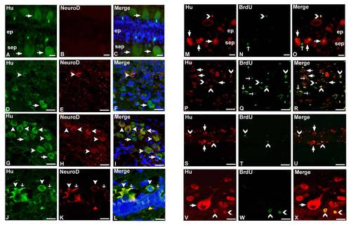 Quantitative analysis of GFAP/BrdU/DAPI expressing cells in whole spinal cord (equivalent to 4 mm length) before and after giving injury. Supp. Fig. S2. Immunohistochemical colocalization of Hu/NeuroD (A-L) and Hu/BrdU (M-X) in zebrafish spinal cord. A-C: Adult uninjured spinal cord section shows many Hu+ cells (→) in subependyma (sep) but are NeuroD-. D-F: The injury epicenter of a 10dpi cord shows Hu+ cells (→) and some of them are colocalized with NeuroD (▼). G–I: Colocalization of Hu and NeuroD (▼) can be seen in the immediate adjacent part of the injury epicenter in the same day cord. J-L: The immediate adjacent part of the injury epicenter of 10dpi cord also shows Hu+/NeuroD+ cells (▼) with small projections (↓). M-O: Uninjured cord section shows many Hu+ cells (→) in subependyma (sep); very few of them are BrdU+ (). P–U: Injury epicenter (P–R) and adjacent normal part (S–U) of the 7dpi cord, both showing Hu+/BrdU- (→), Hu/BrdU+ () and Hu+/BrdU+ () cells. Note that Hu+/BrdU+ cells are small and round shaped and are newly formed neurons. V-X: Higher magnification picture of the immediate adjacent part of the injury epicenter in 7dpi cord showing similar morphological characteristics of Hu+/BrdU+ cells. Scale bar = 10 μm (A-C, M-O), 20 μm (D-I), 40 μm (P-U), 5 μm (J-L, V-X). |