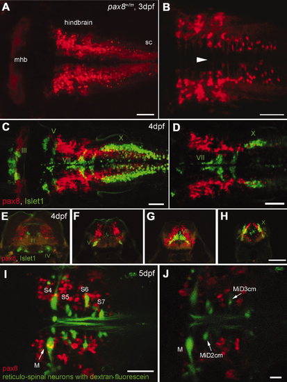 RFP expression in the central nervous system. A,B: Confocal images displaying RFP+ cells in the hindbrain. A is a dorsal view of the hindbrain, and B is a higher magnification of the ventral region. Note the rostral end of the hindbrain lacks RFP+ cells (A). In the ventral region (B), axon-like structures were detected crossing the midline (arrowhead). sc, Spinal cord. C,D: RFP+ cells (red) in the hindbrain compared with the islet-1 GFP-expressing motor neurons (green). C is a stack of confocal images. D displays a single confocal plane near the Xth (X) motor nuclei. Note that two populations (red and green) do not overlap. E–H: A longitudinal series of the hindbrain sections is shown from the level of IIIrd, IVth (E), Vth (F), VIIth (G), and Xth (H) motor nucleus. RFP+ cells are red, and islet-1 expressing motor neurons are green. I,J: RFP+ cells (red) in the hindbrain were compared with the reticular neurons stained by the tracing dye, dextran fluorescein (green). I is a stack of confocal images and J is a single plane at the level of the Mauthner cell (M). S4 through S7 indicates segment number. Magenta-green images are provided in Supporting Information Figure 3. Scale bars = 50 μm in A–D,I; 100 μm in H (applies to E–H); 20 μm in J. |