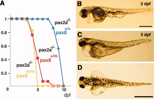 Pax2a/pax8 double mutant. A: Survival curve of pax2a mutants with different pax8 genotypes. Blue, red, and yellow represent pax8+/+, pax8+/m, pax8m/m fish, respectively. B: Lateral view of a double mutant embryo at 2 dpf. C,D: Lateral (C) and dorsal (D) view of a 3-dpf double-mutant larvae. Scale bars = 500 μm in B; 1 mm in D (applies to C,D). |