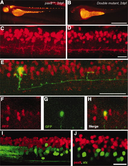Spinal neurons in pax2a/pax8 double mutant. A,B: RFP fluorescence of a pax8+/m embryo (A) and a double-mutant embryo (B) under the same optical condition. The RFP signal is reduced in the double mutant. C,D: The RFP signal in the spinal cord of a pax8+/m embryo (C) and a double mutant embryo (D) near the fifteenth body segment. 3D images were constructed from confocal slices. E–H: Stochastic labeling by GFP (green) identified a neuron with an ipsilateral descending axon in the double mutant. E is a 3D reconstruction. F (RFP), G (GFP), and H (merged) are single-plane images. I,J: The spinal cord of a pax8+/m larva obtained from crossing with the Alx-GFP transgenic line. The image is from an embryo at 4 dpf. I is a 3D reconstruction and J is a single confocal plane. Note that RFP and GFP do not overlap. Magenta-green images are provided in Supporting Information Figure 6. Scale bars = 1 mm in B (applies to A,B); 20 μm in D (applies to C,D); 50 μm in E; 20 μm in J (applies to I,J). |